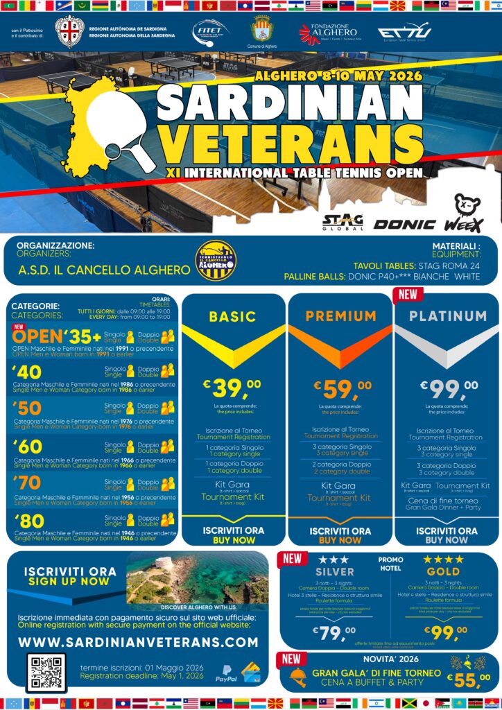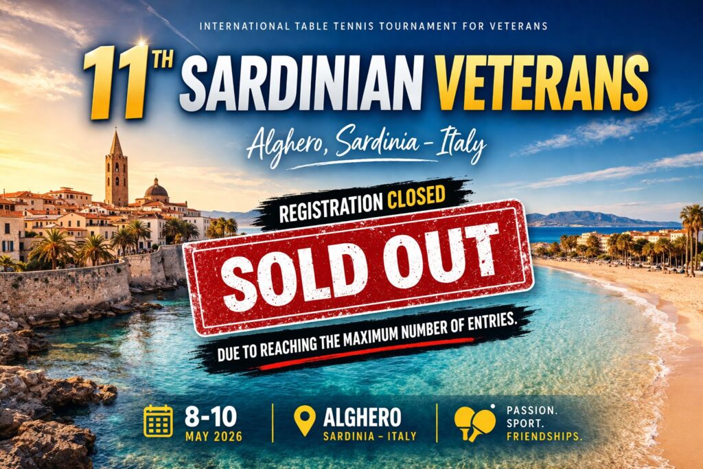 Le iscrizioni al Sardinian Veterans International Table Tennis Tournament sono chiuse: è stato raggiunto il numero massimo di partecipanti. Per inserimento in lista d’attesa, scrivere a asdttilcancello@gmail.com